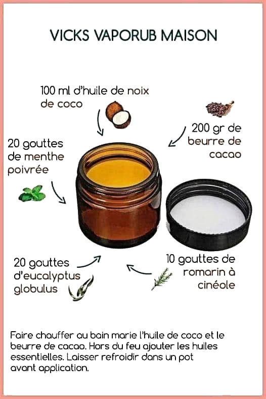 Ce substitut Vicks est fabriqué à partir d’Huiles Essentielles, d’huile de noix de coco et de beurre de cacao.