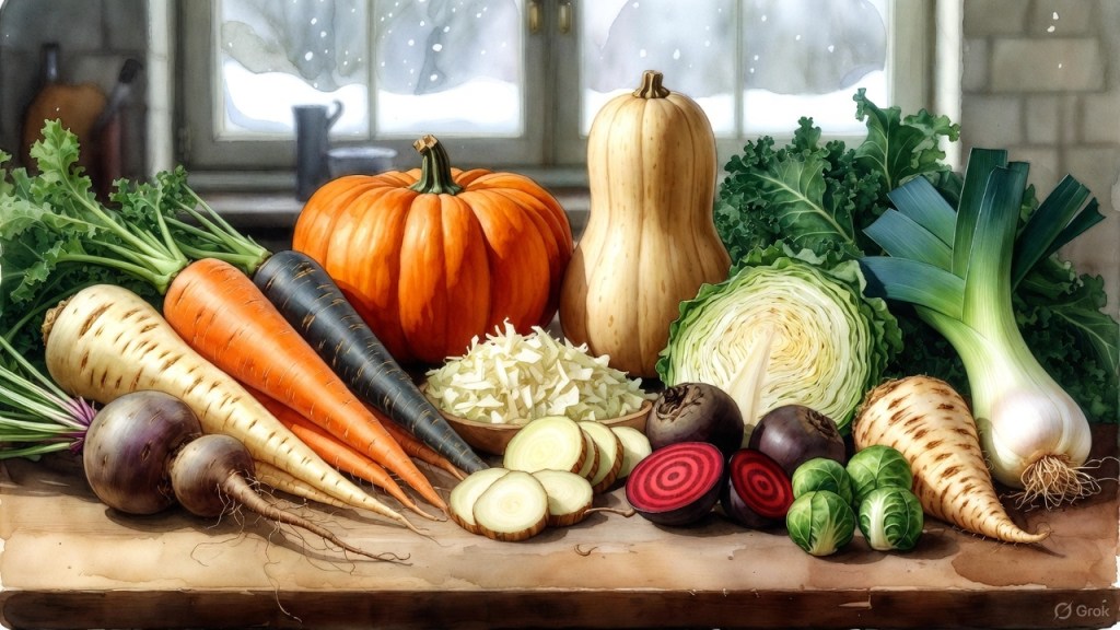 On recherche des légumes profondément ancrés, riches en minéraux, doux et réchauffants, à consommer cuits longuement pour nourrir sans fatiguer la digestion.