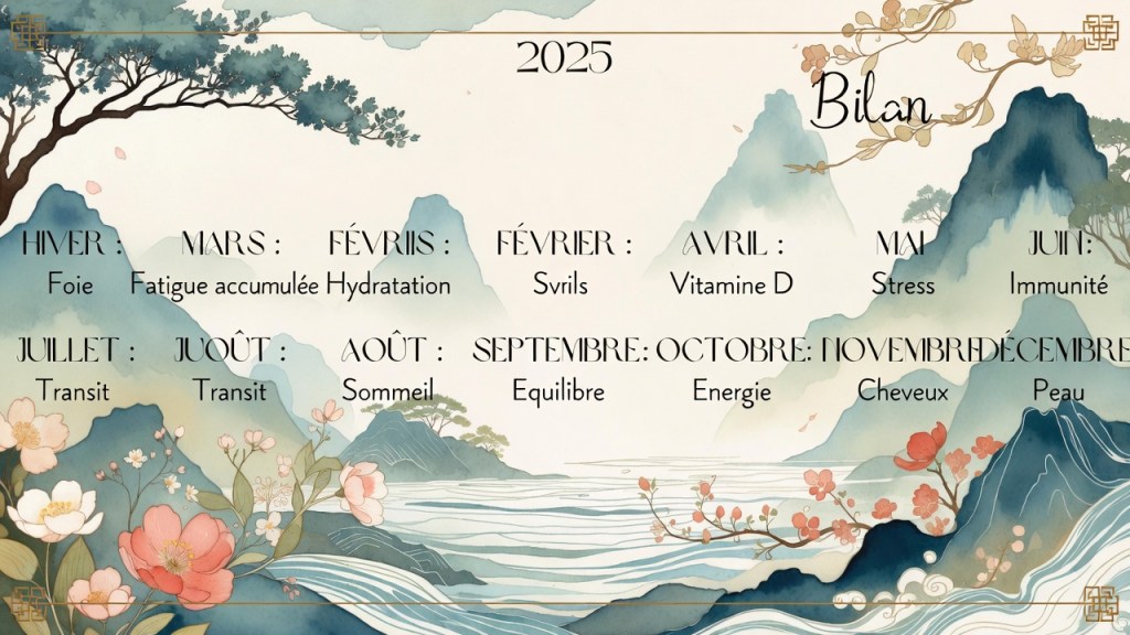 Leçon retenue : dormir avant 23 h et consommer plus d’aliments noirs (sésame, haricots, algues) dès novembre pour arriver en hiver avec des réserves pleines.